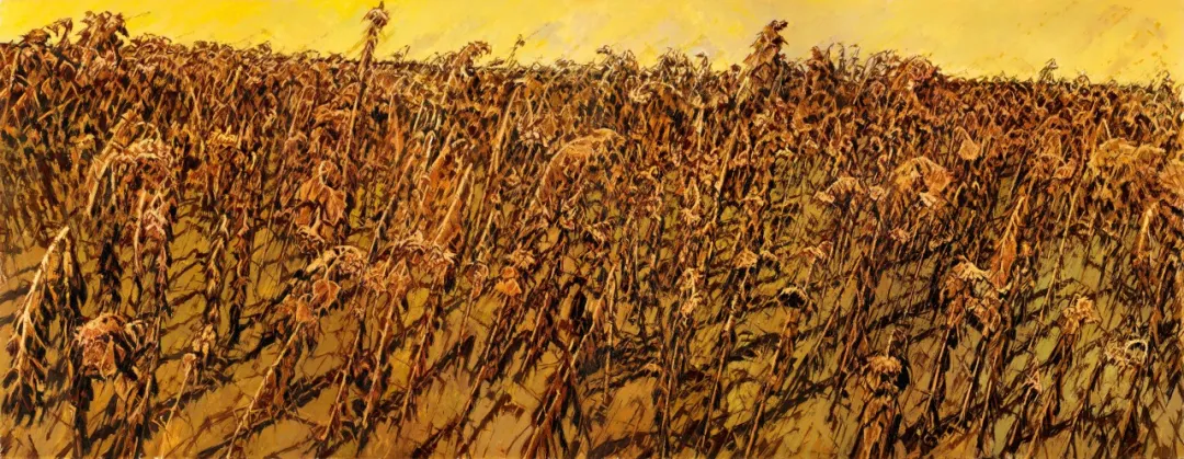《葵原长卷》以浓重油彩堆叠出葵原的苍茫,葵杆如林、葵盘如炬,犹如一代人默然伫立于历史荒原。许江以画笔放牧葵园四季:春葵破土,颤栗生长;盛夏葵盘在浮雕般的色层中迎风舞动;秋暮垂首,籽实累累如岁月铭文;雪原枯葵则以破碎肌理隐喻涅槃后的守望,将个体岁月与集体理想镌刻为一代人的精神史诗。