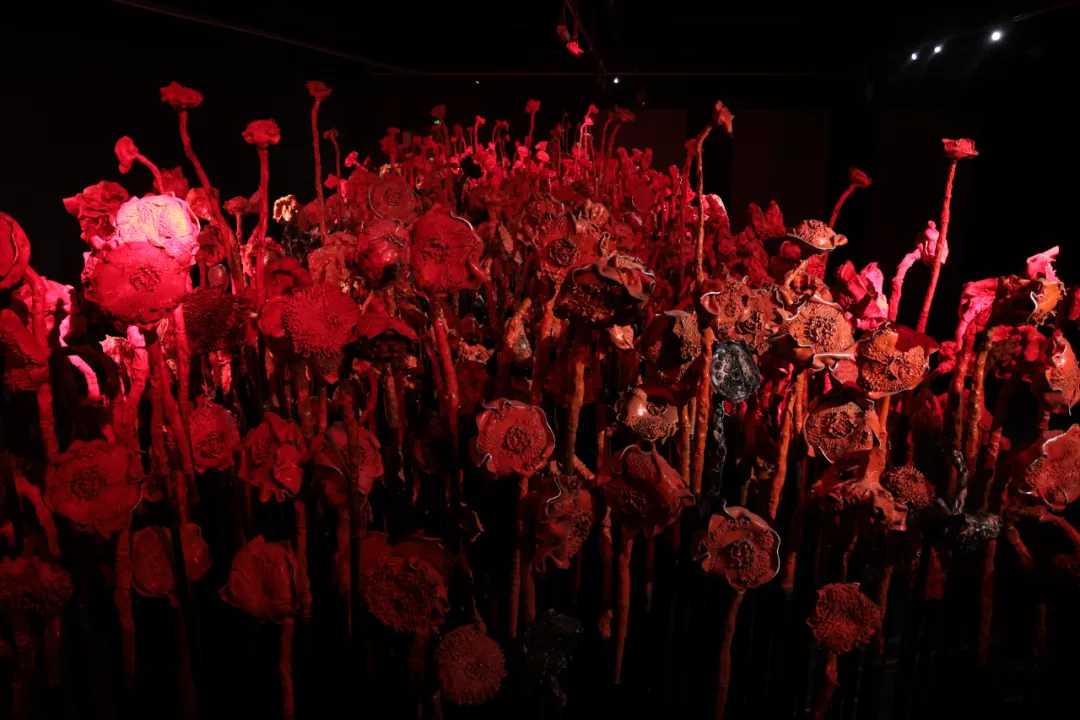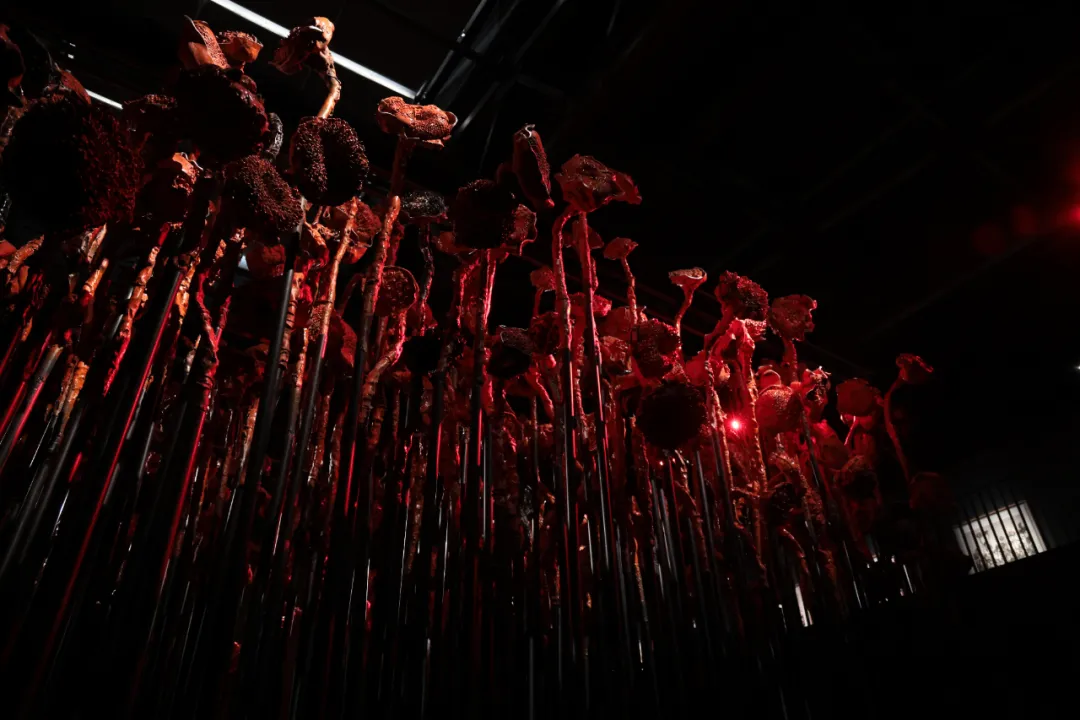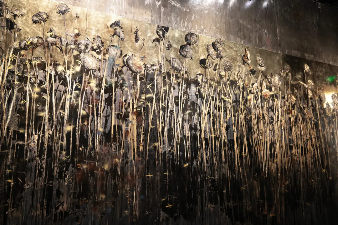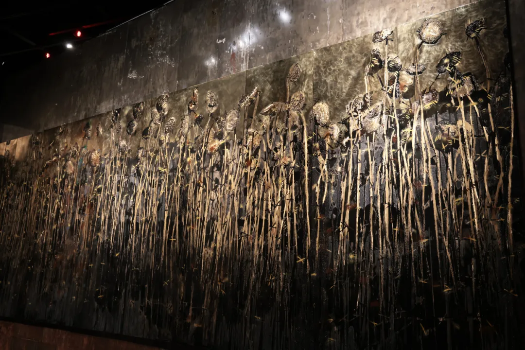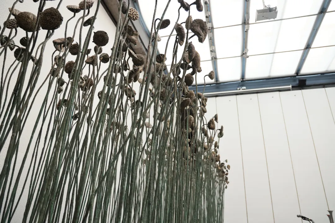 莲生水泽,葵立旱地,共生会否可能?许江与团队制作了上千个葵头与莲蓬头,以铜、铝为质,打磨如烛,熠熠生辉。这一枝枝葵头是烛火,是在荒原里读过的书。这葵又与莲比肩并立,生长在沙土与水泽中的垂直的生物能否共生?火与书会否因燃烧而共生?这片火的荒原,曾生长于天安门国博的序厅、德累斯顿重建的博物馆、莱茵与莫梭尔交汇的德意志角、黄浦江畔艺术宫的穹顶。而今,它抵达三江汇流的甬城——火焰不息,缓缓升腾,以炽红点亮山河故土。