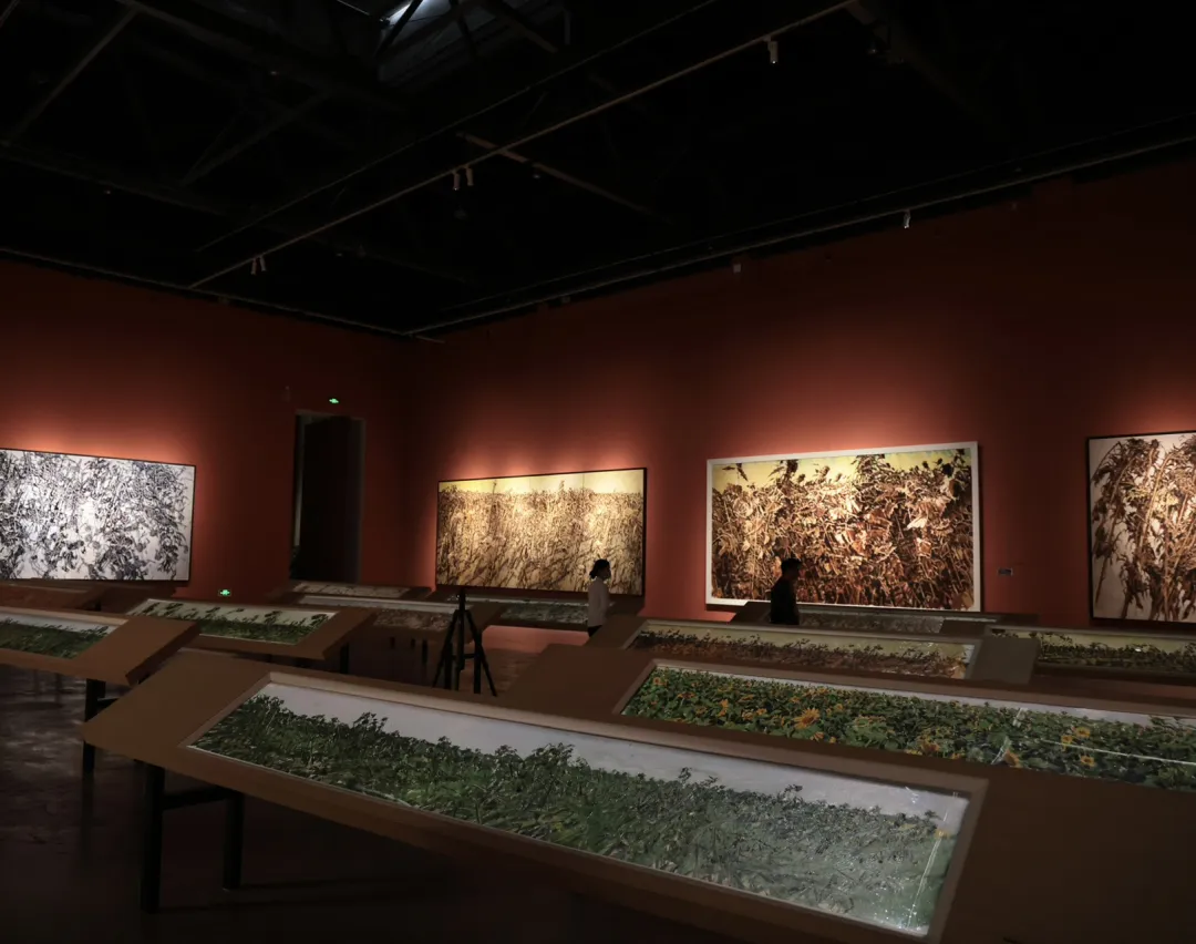 “共生”展厅内,三屏影像并置,交织成一道视觉史诗——铜锤击打葵盘,星火飞溅如雨;万葵逐日,又在秋风中垂首如鎏金。许江立于葵原,画笔与葵叶同颤,在巨幅画布上挥写万千葵姿。影像与雕塑群像共同构建了一个多重感知的现场:葵原的枯荣轮回、金属的千锤百炼、艺术家的孤身行野,共生不再是生物学意义上的并存,而是升华为一种跨越物种、时空与媒介的生命哲学,共同诠释着“共生”的深层内核:那是毁灭与新生的对话,是个体与时代的共鸣,亦是人文之山巍然矗立的精神见证,更是大地与命运间永恒的相互滋养。