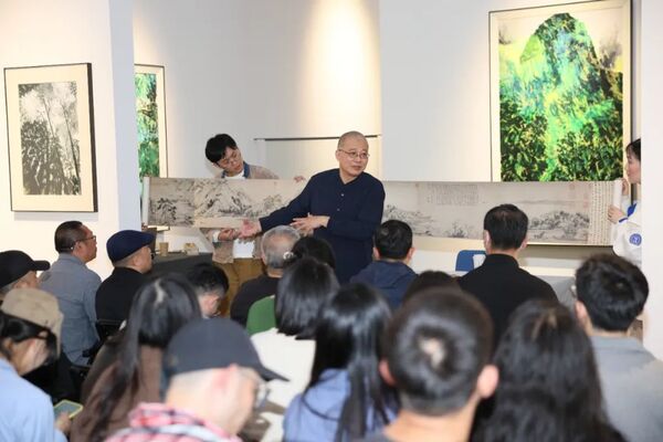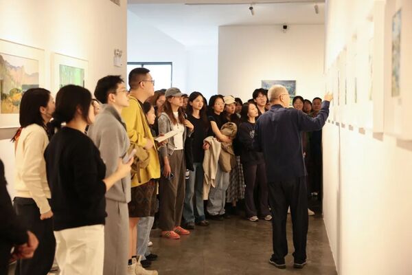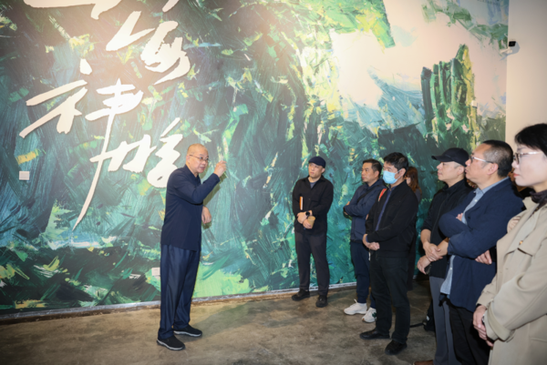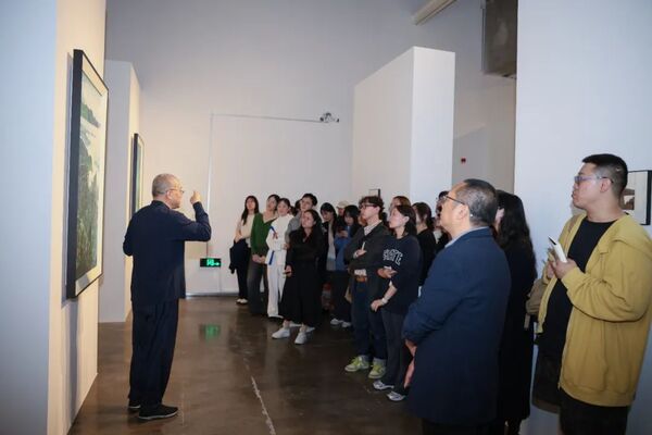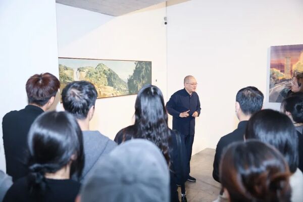 课程分为两部分,许江教授首先带领师生参观“山海神游——诗路浙江山水绘画台州主题展”并作详细导览,随后开授题为《绘画中的山水精神》的讲座。